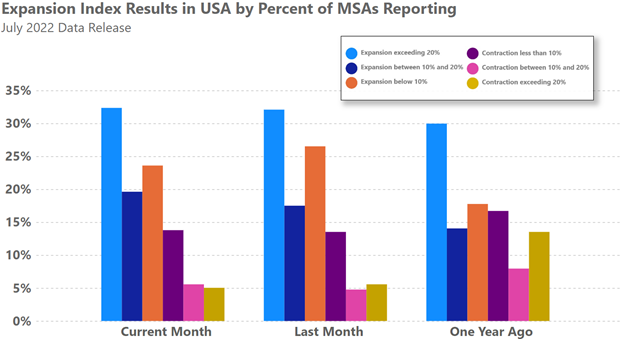 Only a small proportion of states and provinces reported contracting activity. In the United States, Washington state contracted the most while the Canadian provinces of Manitoba and Newfoundland and Labrador reported contracting activity as both posted expansion readings below 1.0 for another consecutive month.