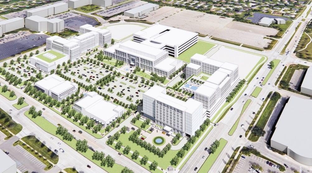 A rendering shows an overview of Somerset West anchored by the University of Michigan medical facility with attached parking garage. Image: Forbes