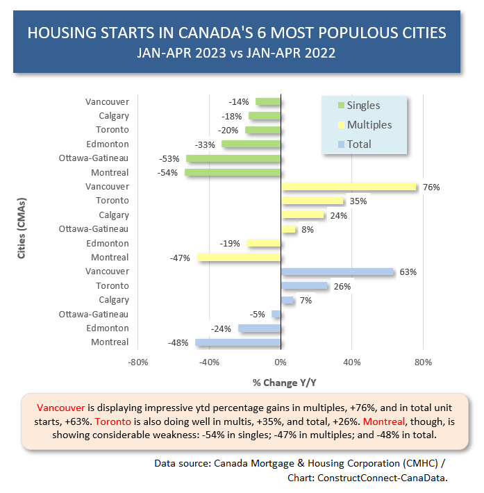 - As for year-to-date percentage changes among major Canadian cities, Vancouver is the standard bearer at +76% for multis and +63% for total (Graph 15). Multifamily starts, in units, are 92% of Vancouver’s total. In Montreal, multis claim 94% of the city’s total (Graph 15).