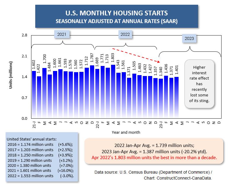 - The series of hikes in U.S. interest rates caused a more or less steady decline in new home starts from April 2022 through January 2023. In the first four months of 2023, however, U.S. housing starts have leveled off close to 1.4 million units seasonally adjusted at an annual rate (SAAR) (Graph 1).