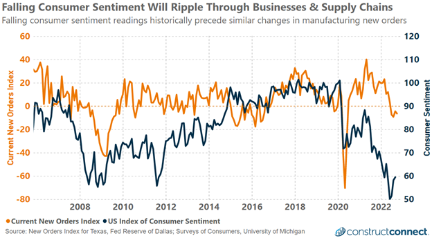 As early as July 2021, consumer sentiment readings began regularly moving lower before touching an all-time low reading of 50 in June 2022, per the University of Michigan's Index of Consumer Sentiment. However, it took until the fourth quarter of 2021 before manufacturing new orders activity readings at both the state and national levels would begin reporting consecutive and sequential months of lower readings.