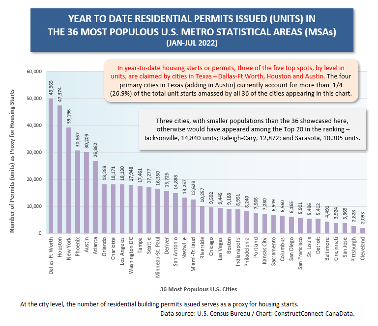 - Texas is home to three of the top five U.S. cities for the year-to-date level of housing starts: Dallas-Fort Worth (49,965 units); Houston (47,374 units); and Austin (30,209 units) (Graph 7).