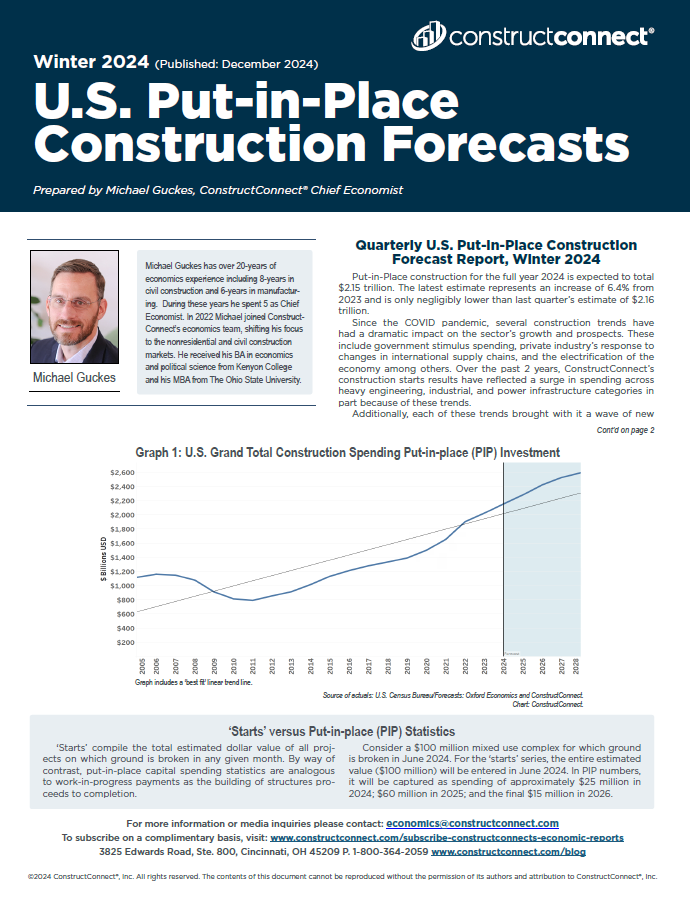 ConstructConnect Chief Economist Michael Guckes released the US Put-in-Place Construction Forecast for Winter 2024 today. According to the report, total put-in-place construction spending for 2024 is expected to reach $2.15 trillion, marking a 6.4% increase from 2023.